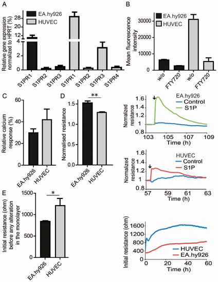 To investigate the role of S1P in EC barrier function, the human endothelial cell line EA.hy926 and primary HUVEC were used. EA.hy926 represents a somatic cell hybrid of HUVEC and the lung epithelial carcinoma cell line A549. Quantitative PCR demonstrated that both, HUVEC and EA.hy926 expressed mainly S1PR1 followed by S1PR3, although HUVEC expressed both receptors stronger than EA.hy926 (Figure 1A). Higher expression of S1PR1 in HUVEC was confirmed by flow cytometry (FACS) using a highly specific antibody against human S1PR1 (Figure 1B). Specific staining was demonstrated by the incubation of cells with 1 µM FTY720 overnight, which led to S1PR1 internalization and consequently low cell surface staining as expected (Figure 1B). In line with these expression data, HUVEC responses were greater than those of EA.hy926 after stimulation with 100 nM S1P in intracellular calcium flux measurements (Figure 1C). However, to our surprise, EA.hy926 responses were greater in ECIS measurements after stimulation with 1 µM S1P compared to HUVEC, indicating a higher barrier stabilization in EA.hy926 (Figure 1D). Basal resistance of the EC monolayer, however, was lower in EA.hy926 compared to HUVEC (Figure 1E).