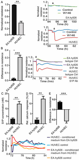 Comparison of S1P-signaling in HUVEC and EA.hy926. (A) Resistance following treatment with 3 µM of the S1PR1 antagonist W146. Normalized resistance values were taken at the time of the established maximal change of resistance after W146 treatment divided by resistance of carrier-treated control cells at the same time and are means ± SEM, n = 3, ** p < 0.001, determined by two-sided Student’s t-test. Line plots represent one experiment out of three with black arrows indicating the addition of W146 or vehicle at the corresponding time. (B) Resistance following treatment with 120 µg/mL of the anti-S1P antibody Sphingomab. The difference in resistance is the difference between S1P-antibody treatment and isotype control antibody treatment taken at the time of maximal change of resistance after treatment. Shown are means ± SEM, n = 3, *** p < 0.001, determined by a two-sided Student’s t-test. Line plot represents one experiment out of three with a black arrow indicating the addition of Sphingomab (S1P Ab) or isotype control antibody (Isotype Ctrl) at the corresponding time. (C) LC-MS/MS quantification of extracellular S1P production by EA.hy926 and HUVEC. (D) Intracellular calcium response in rat hepatoma HTC4 cells transfected with human S1PR1 and the human Gαi subunit of trimeric G proteins, stimulated with lipid extracts from EA.hy926 and HUVEC as indicated. (E) Resistance following medium exchange. The difference in resistance is the difference between exchange of conditioned medium and control medium at the time of maximal change of resistance after medium exchange. Line plot represents one experiment out of three with a black arrow indicating the exchange of medium at the corresponding time, controls represent unconditioned medium. (C–E) Data are means ± SEM, n = 3, ** p < 0.01, *** p < 0.001, determined by a two-sided Student’s t-test.