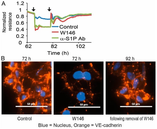 Dependence and reversibility of EC barrier stability in HUVEC and EA.hy926. (A) Resistance following treatment with 3 µM S1PR1 antagonist W146 or 120 µg/mL of anti-S1P antibody Sphingomab, followed by the removal of the added substances. Line plot represents one experiment out of three with black arrows indicating the addition and removal of W146 or Sphingomab at the corresponding time points. (B) Immunofluorescence staining of VE-cadherin in HUVEC after addition of 3 µM S1PR1 antagonist W146, followed by removal of the added substance. Representative images from one out of three individual experiments are shown. Pictures were taken 6 h after addition of W146 and 12 h following removal of W146.