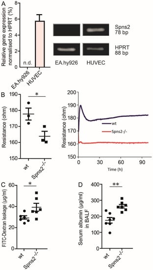 Role of Spns2 for EC barrier stability. (A) qPCR analysis of Spns2 in EA.hy926 and HUVEC, n = 3, means ± SEM. Images show representative agarose gel electrophoresis signals of amplified PCR products for HPRT and Spns2. (B) Difference in initial non-stimulated resistance of primary lung ECs isolated from wt and Spns2 deficient mice in ECIS measurements, means ± SEM, n = 3, * p < 0.05, determined by two-sided Student’s t-test. Single values represent the resistance values for separate mice taken 90 h after seeding. Line plot represents one experiment out of three. (C) FITC-dextran leakage assay with primary lung endothelial cells isolated from wt and Spns2 deficient mice, means ± SEM, n = 6, * p < 0.05, determined by two-sided Student’s t-test. (D) Serum albumin measurement in BALF isolated from wt and Spns2 deficient mice, means ± SEM, n = 6, ** p < 0.01, determined by a two-sided Student’s t-test.