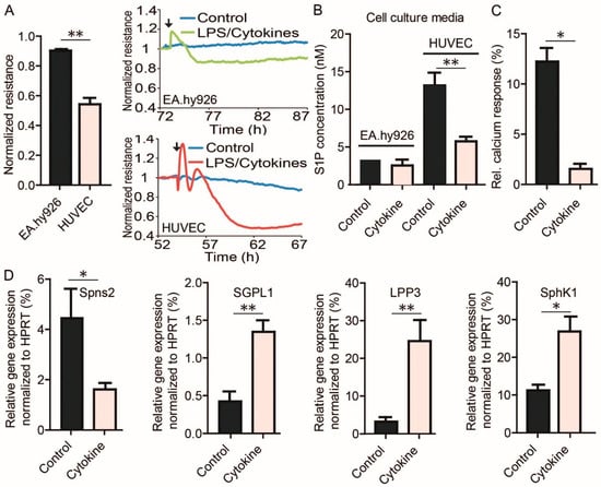 Influence of LPS and cytokines on EC barrier stabilization. (A) Resistance following treatment with a mix of LPS and cytokines (50 ng/mL IL1β, 50 ng/mL TNFα, 1 µg/mL LPS). Normalized resistance values are resistance of cells 12 h after LPS/cytokine treatment divided by resistance of carrier-treated control cells at the same time and are means ± SEM, n = 3, ** p <0.01, determined by a two-sided Student’s t-test. Line plots represent one experiment out of three with black arrows indicating the addition of LPS and cytokines or vehicle at the corresponding time. (B) LC-MS/MS quantification of extracellular S1P production by EA.hy926 and HUVEC after stimulation with LPS and cytokines or vehicle control. (C) Intracellular calcium response in rat hepatoma HTC4 cells transfected with human S1PR1 and the human Gαi subunit of trimeric G proteins, stimulated with lipid extracts from HUVEC without or with LPS and cytokines as indicated. (D) qPCR analysis of Spns2, SGPL1, LPP3, and SphK1 expression in cytokine mix treated HUVEC. (B–D) Data are means ± SEM, n = 3, * p < 0.05, ** p < 0.01, determined by two-sided Student’s t-test.