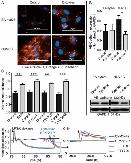 Role of S1P and S1PRs in EC barrier destabilization induced by LPS and cytokines. (A) Immunofluorescence staining of VE-cadherin and Western blot analysis of VE-cadherin and GAPDH in EA.hy926 and HUVEC after stimulation with LPS and cytokines or vehicle. Representative images from one out of three individual experiments are shown, size bar = 50 µm. (B) Western blot quantification (top) and representative Western blot (bottom) of VE-cadherin expression in EA.hy926 and HUVEC after stimulation with LPS and cytokines or vehicle, means ± SEM, n = 3, * p < 0.05, determined by two-sided Student’s t-test. (C) Resistance following treatment with a mix of LPS and cytokines (50 ng/mL IL1β, 50 ng/mL TNFα, 1 µg/mL LPS), and re-stimulated with 1 µM of the S1PR1 agonist CYM5442, 1 µM of the S1PR1,3,4,5 agonist FTY720-phosphate and its non-phosphorylated precursor FTY720, and 1 µM S1P. Line plots represent one experiment out of three with black arrows indicating the addition of stimuli at the corresponding time points. The dark grey line represents an unstimulated control, the light grey line represents a control stimulated with LPS and cytokines without second stimulation. Bar graph represents means ± SEM, n = 3, ** p < 0.01, *** p < 0.001, determined by two-sided Student’s t-test. Normalized resistance values were taken before (controls) and after treatment with S1P, FTY720-P, FTY720, and CYM5442 at the time of the established maximal change of resistance of cells divided by resistance of cells before LPS/cytokine treatment.