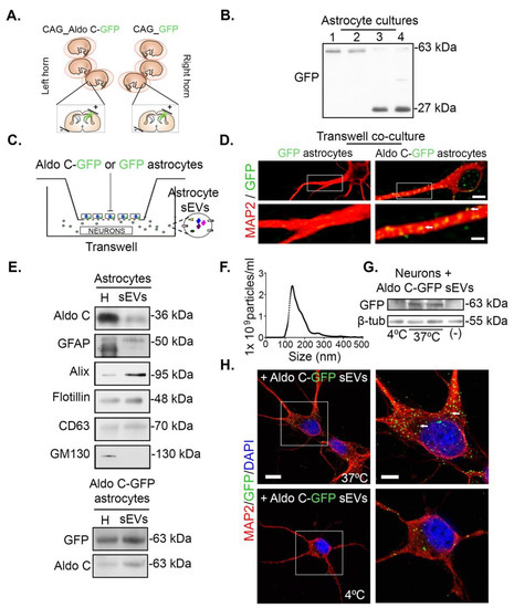 We have shown that the astrocyte’s specific glycolytic enzyme Aldolase C (Aldo C) is present in sEVs and that its content in the vesicles is regulated in vivo and in vitro: Astrocyte-derived sEVs contain Aldo C and its levels increase in rat cerebrospinal fluid and in serum sEVs after exposure of animals to stress induced by movement restriction [17,18,19]. In addition, we have recently shown that Aldo C expressed in brain astrocytes can be collected in sEVs isolated from rat blood serum, supporting the capacity of astrocyte-derived sEVs to cross biological barriers and to serve as regulators of intercellular signaling [19]. However, it is not known whether neurons, which are in close proximity to astrocytes, can incorporate the derived sEVs containing Aldo C nor whether they could impact neuronal function.
