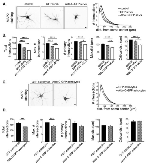 The sEVs derived from astrocytes decrease dendritic complexity of hippocampal neurons. (A). Left, representative inverted images of hippocampal neurons incubated with sEVs were stained with MAP2 for morphological analysis. Scale Bar: 10 µm. Right, Sholl analysis of neurons treated with vehicle only (control) or incubated with sEVs derived from GFP expressing astrocytes (GFP sEVs) or Aldo C-GFP sEVs. (B). Quantification of morphological parameters, namely total intersections (control 142 ± 5, n = 141; GFP sEVs 107 ± 5, n = 116; Aldo C-GFP sEVs 82 ± 4, n = 126), maximum number of intersections (max. # intersections) (control 10.7 ± 0.3; GFP sEVs 8.7 ± 0.2; Aldo C-GFP sEVs 7.4 ± 0.2), number of primary intersections (# primary intersections) (control 6.6 ± 0.2; GFP sEVs 6.2 ± 0.2; Aldo C-GFP sEVs 5.5 ± 0.2), maximum distance (max. dist.) (control 105 ± 3; GFP sEVs 95 ± 4; Aldo C-GFP sEVs 80 ± 3), and critical distance (control 22.1 ± 0.8; GFP sEVs 20 ± 1; Aldo C-GFP sEVs 16.3 ± 0.8) are displayed as mean ± standard error of N = 3 independent experiments. **** p < 0.0001, *** p < 0.001, ** p < 0.01, or * p < 0.05 using one-way ANOVA followed by Tukey’s multiple comparison test. (C). Left, representative inverted images of neurons co-cultured with either GFP or Aldo C-GFP astrocytes are displayed. Scale Bar: 10 µm. Right, Sholl analysis of neurons co-cultured with GFP- or Aldo C-GFP-expressing astrocytes (Astro GFP and Astro Aldo C-GFP, respectively). (D). Total intersections (Astro GFP 167 ± 7, n = 70; Astro Aldo C-GFP 134 ± 6, n = 70), maximum number of intersections (Astro GFP 13.0 ± 0.4; Astro Aldo C-GFP 10.8 ± 0.4), number of primary intersections (Astro GFP 5.1 ± 0.3; Astro Aldo C-GFP 4.3 ± 0.3), critical distance (Astro GFP 22 ± 1 µm; Astro Aldo C-GFP 23 ± 1; p = 0.6944), and maximal distance (Astro GFP 110 ± 3 µm; Astro Aldo C-GFP 107 ± 4 µm) are displayed as mean ± standard error of three independent experiments. **** p < 0.0001, *** p < 0.001, ** p < 0.01, or * p < 0.05 using the Welch’s t-test.