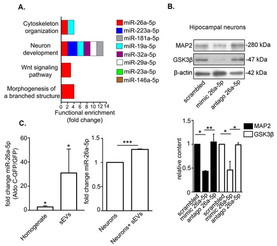In order to identify molecular cargoes in astrocyte-derived sEVs able to promote morphological changes in neurons, we took advantage of a comprehensive study by Jovičić et al. identifying miRNAs in total homogenates from cultured astrocytes [33]. To generate a robust short-list of candidates, we selected the most abundant miRNAs (cycle threshold < 25), which have been confirmed to be present in astrocytes by at least one other independent study [13,34,35,36,37,38,39,40,41,42]. Then, the identified candidates, namely miR-26a5p, miR-23a-5p, miR-223a-5p, miR-19a-5p, miR-32a-5p, miR-146a-5p, miR-181-5p, and miR-29a-5p, were categorized using a selection algorithm according to the function of their predicted targets (see Methods; Figure 3A). Notably, the identified miRNAs shared a number of targets significantly associated with the regulation of cytoskeleton organization, neuronal development, Wnt signaling pathway, and morphogenesis of a branched structure (Figure 3A). In turn, the predicted targets for miR-26a-5p, miR-223a-5p, miR-19a-5p, miR-32a-5p, miR-29a-5p, and miR-181a-5p shared the more general category neuron development, while targets for miR-146a-5p and miR23a-5p showed no significant functional enrichment for any category (Figure 3A). Very interestingly, miR-26a-5p (miR-26a) was found to regulate targets participating in all four categories with a high functional enrichment score (Figure 3A). This miRNA was detected in control astrocyte-derived sEVs using RT-qPCR (cycle threshold = 30.3 ± 1.3, N = 6). Consistent with this finding, the presence of miR-26a-5p in astrocyte-derived exosomes has been described previously [33].