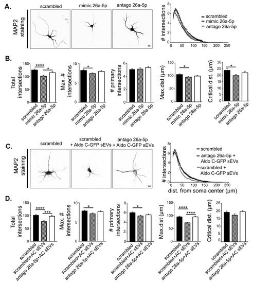 miR-26a mediates the Aldo C-GFP sEVs-induced decrease in the complexity of hippocampal dendrites. Hippocampal neurons were magnetofected either with scrambled, mimic 26a-5p, or antago 26a-5p sequences. (A). Left, representative inverted images of MAP2-stained neurons were used for the morphological quantification. Scale Bar: 10 µm. Right, Sholl analysis. (B). Total intersections (scrambled 125 ± 4, n = 119; mimic 26a-5p 102 ± 3, n = 120; antago 26a-5p 115 ± 4, n = 120), maximum number of intersections (max. # intersections) (scrambled 8.2 ± 0.2; mimic 26a-5p 7.4 ± 0.2; antago 26a-5p 8.0 ± 0.2), number of primary intersections (# primary intersections) (scrambled 5.1 ± 0.1; mimic 26a-5p 5.2 ± 0.2; antago 26a-5p 5.4 ± 0.2), maximum distance (max.dist.) (scrambled 106 ± 3; mimic 26a-5p 96 ± 3; antago 26a-5p 100 ± 3), and critical distance (scrambled 24 ± 1; mimic 26a-5p 19.7 ± 0.9; antago 26a-5p 22 ± 1) are displayed as mean ± standard error of N = 5 independent experiments. **** p < 0.0001, *** p < 0.001 or * p < 0.05 using one-way ANOVA followed by Tukey’s multiple comparison test. Hippocampal neurons were magnetofected with scrambled or antago 26a-5p and then treated with Aldo C-GFP sEVs. (C). Left, inverted images of MAP2-stained neurons were used for the morphological quantification. Scale Bar: 10 µm. Right, Sholl analysis. (D). Only for these depicted graphs Aldo C-GFP sEVs are denominated as AC sEVs. Total intersections (scrambled 101 ± 3, n = 217; scrambled+ Aldo C-GFP sEVs 77 ± 3, n = 173; antago 26a-5p + Aldo C-GFP sEVs 97 ± 4, n = 185), maximum number of intersections (scrambled 7.9 ± 0.2; scrambled+ Aldo C-GFP sEVs 7.0 ± 0.2; antago 26a-5p + Aldo C-GFP sEVs 7.7 ± 0.2), number of primary intersections (scrambled 6.0 ± 0.2; scrambled+ Aldo C-GFP sEVs 5.3 ± 0.2; antago 26a-5p + Aldo C-GFP sEVs 56 ± 0.2), maximum distance (scrambled 95± 2; scrambled+ Aldo C-GFP sEVs 72 ± 2; antago 26a-5p + Aldo C-GFP sEVs 95 ± 3), critical distance (scrambled 19.1 ± 0.8; scrambled+ Aldo C-GFP sEVs 17.2 ± 0.8; antago 26a-5p + Aldo C-GFP sEVs 19.5 ± 0.9) are displayed as mean ± standard error of N = 4 independent experiments. **** p < 0.0001, *** p < 0.001 or * p < 0.05 using one-way ANOVA followed by Tukey’s multiple comparison test.