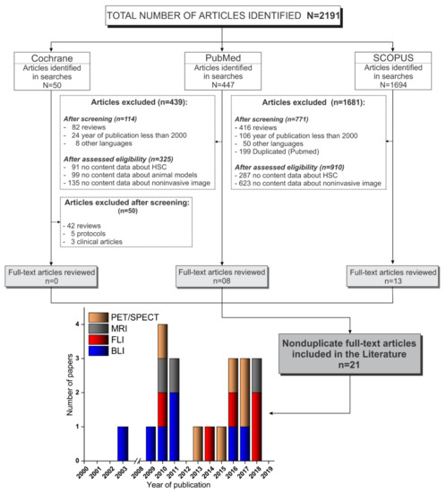 We searched publications between January 2000 and January 2020, indexed in PubMed, Scopus, and Cochrane Library, and a total of 2191 articles were identified. Of the 50 articles identified in Cochrane Library, none were included because, out of the articles, 42 were reviews, 5 were only protocols, and 3 were clinical articles. Of the 447 articles identified in Pubmed, 114 were excluded after screening (82 reviews, 24 publications before 2000, and 8 publications in other languages) and 325 articles were excluded after assessing eligibility (91 reported no data about HSC, 99 reported no data about animal models, and 135 reported no data about noninvasive imaging); thus, only 8 articles were included from this database. Of the 1694 articles identified in Scopus, after screening, 771 articles were excluded (416 reviews, 106 publications before 2000, 50 publications in other languages, and 199 duplicated in Pubmed search), and after assessing eligibility, 910 articles were excluded (287 reported no data about HSC and 623 reported no data about noninvasive imaging); thus, only 13 articles were included from this database. In total, only 21 nonduplicate full text articles were included in this review [9,11,16,17,18,19,20,21,22,23,24,25,26,27,28,29,30,31,32,33,34], as depicted in Figure 1.