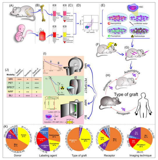 Schematic illustration of the bone marrow transplantation process, from the isolation of HSCs to their implantation, and tracking evaluation by noninvasive imaging techniques. (A) Main cell donors; (B,C) main cell sources for HSC extraction; (D) HSC characterization after isolation; (E) contrast agent used in the HSC labeling; (F) animal pre-condition (irradiation) before HSC transplantation; (G) cell route used in the transplantation; (H) type of graft; (I) noninvasive imaging technique used in HSC tracking; (J) imaging modality features; and (K) the graphic of the percentual distribution of the main element analyzed in the systematic review.