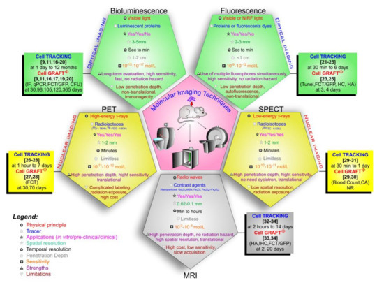 MRI provides excellent anatomical resolution, in vivo cell tracking and graft-host with 3-dimensional information, high penetration depth, does not require the use of ionizing radiation, and is easy to translate into clinical application, although this modality is limited by low sensitivity and high instrumentation cost, as well the tracer dilution upon cell division. MRI is now emerging and rapidly expanding in all fields. In addition, it has the advantages of safety, high spatial and temporal resolution, and direct applicability to cell tracking in clinical studies. MRI specificity can be increased by the use of the contrast agents with magnetic character (paramagnetic and superparamagnetic) [44,45,46,47,48].