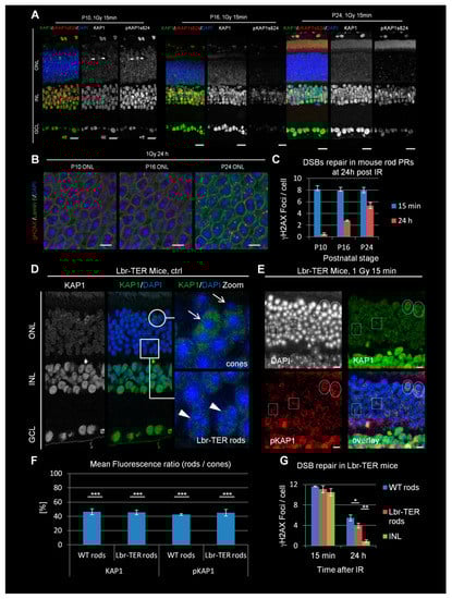 Double-stranded break (DSB) signaling and repair in developing WT and adult Lbr-TER mouse retinae. (A) Immunofluorescence images KAP1 (green) and radiation-induced pKAP1 (red) at 15 min after 1 Gy in the retinae of P10, P16, and P24 WT mice. Nuclei were counterstained with 4′-6-Diamidin-phenylindol (DAPI) (blue). Scale bars represent 15 μm. (B) Immunofluorescence images of γH2AX (red) at 24 h after 1 Gy in the ONL of P10, P16, and P24 WT mice. Nuclei were counterstained with DAPI (blue) and nuclear borders with lamin B (green). Scale bars represent 5 μm. (C) Quantification of residual IR-induced γH2AX foci in rod photoreceptors (PRs) P10, P16, and P24 WT mice at 15 min and 24 h after 1 Gy. (D) Immunofluorescence images of KAP1 (green) in the retinae of adult Lbr-TER mice. Scale bar represents 15 µm. Strong KAP1 expressing cones are encircled and marked by arrows in the enlarged pictures. Weakly KAP1 expressing Lbr-TER rods are framed by boxes and marked by arrowheads in the enlarged pictures. (E) Immunofluorescence images of KAP1 (green) and radiation-induced pKAP1 (red) in the retinae of adult Lbr-TER mice at 15 min after 1 Gy. Scale bar represents 5 µm. Strong KAP1 expressing cones with IR-induced pKAP1 signals are encircled. Boxes show Lbr-TER rods with weak KAP1 expression and no IR-induced pKAP1 signals. (F) Quantification of the KAP1 and pKAP1 signals in the nuclei of WT and Lbr-TER rods in comparison to cones. The pKAP1 ratio was measured at 15 min after 1 Gy. (G) Quantification of residual IR-induced γH2AX foci in WT and Lbr-TER rod PRs at 15 min and 24 h after 1 Gy. All quantitative data are presented as mean ± SEM from three experiments (n = 3). p-values were obtained by t-test and represent a comparison of all cells analyzed in the indicated cell population (at least 40 cells per data point and experiment for foci quantification and 10 nuclei for KAP1/pKAP1 fluorescence measurements in rods and cones) with *: p < 0.05; **: p < 0.01, and ***: p < 0.001. ONL = outer nuclear layer, INL = inner nuclear layer, GCL = ganglion cell layer.