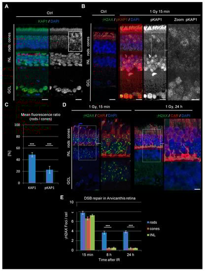 It was recently shown that, in difference to nocturnal species, diurnal rodents of the genera Arvicanthis contain equal numbers of cones and rods in their retina (Figure S3A) [26]. Interestingly, both rods and cones in the sudanian grass rat, Arvicanthis ansorgei, lack expression of LBR and lam A/C and thus possess an inverted arrangement of chromatin (Figure S3B–D). Therefore, studying cones in this species might further help to disentangle possible connections between DSB repair and chromatin arrangement. We compared the levels of KAP1 expression and IR-induced KAP1 phosphorylation within the PRs of Arvicanthis and mice. Similar to mice, rods of Arvicanthis showed a lower staining intensity for KAP1 than the apically located cones and even further diminished IR-induced pKAP1 signals (Figure 2A–C). Having identified a cellular system with robust KAP1 phosphorylation in an inverted chromatin background, we next studied the DSB repair capacity in this cell type. The retinae of irradiated Arvicanthis showed a similar formation of γH2AX foci at 15 min after IR in rods, cones, and cells of the INL (Figure 2D,E). Strikingly, cones were nearly devoid of γH2AX foci at 8 h after IR, whereas rods still showed a robust number of residual DSBs even at 24 h after the treatment. DSB repair in cones was comparable to cells of the INL, showing that efficient DSB repair is possible in cells with nuclear inversion but requires KAP1 phosphorylation. Thus, the data derived from the cones of Arvicanthis strengthen our conclusion that the DSB repair efficiency requires robust KAP1 phosphorylation, while the nuclear inversion has little or no impact.