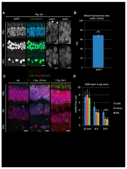 KAP1 expression and DSB repair in pig retinae. (A) Immunofluorescence images of KAP1 (green) in pig retinae. Nuclei were counterstained with DAPI (blue). Arrowheads in the enlarged pictures show cone PRs. Scale bars represent 10 μm in whole retina and 5 µm in enlarged pictures. (B) Quantification of the KAP1 signal in the nuclei of rods compared to cones. (C) Immunofluorescence images of radiation-induced γH2AX foci (green) and lamin B (red) in ctrl and irradiated pig retinae at 15 min and 24 h after 1 Gy. Nuclei were counterstained with DAPI (blue). Scale bars represent 15 μm. (D) Quantification of residual IR-induced γH2AX foci in rods, cones, and INL cells at 15 min, 8 h, and 24 h after 1 Gy irradiation. Data are presented as mean ± SEM from three experiments (n = 3). Control values are subtracted. p-values were obtained by t test and represent a comparison of all cells analyzed in the indicated cell population (at least 20 cells per data point and experiment for foci quantification and 10 nuclei for KAP1 fluorescence measurements in rods and cones) with ***: p < 0.001. ONL = outer nuclear layer, INL = inner nuclear layer, GCL = ganglion cell layer, lam B = lamin B.