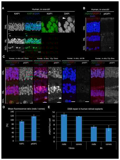 We next analyzed KAP1 expression and phosphorylation levels in PRs of the human retina after in vitro irradiation. The retina of one human eye was isolated and subdivided into several pieces, which were cultivated as retinal explants and irradiated with 1 Gy. As the result of a delay of three hours due to transportation between isolation and irradiation of the samples (see Section 2), we took various control samples. One control sample was fixed directly after retina isolation without cultivation as an explant (Figure 4A,B, referred to as in vivo ctrl). Additional unirradiated controls were fixed at 15 min (in vitro ctrl 15 min) or 8 h (in vitro ctrl 8 h) after isolation (Figure 4C). The analysis showed similar KAP1 staining intensities between rods and cones, an observation unique for the human retina (Figure 4A,D). Staining against pKAP1 showed only a weak signal in the ONL of the in vivo control sample (Figure 4B), while the 15 min in vitro ctrl revealed a surprisingly strong signal. The 8 h in vitro ctrl sample was again weak for pKAP1 (Figure 4C and Figure S5A). Of note, KAP1 expression levels were similar for all three ctrl samples as well as for the irradiated samples (Figure S5B,C). To test whether the pKAP1 signal in the 15 min in vitro ctrl sample originated from DSB formation due to transportation, we stained against γH2AX but observed similarly low DSB numbers in all three ctrl samples (Figure 4B,C). In contrast, DSB numbers increased substantially when explants were irradiated with 1 Gy and fixed 15 min later (Figure 4C). IR also increased the pKAP1 signal compared to the 15 min in vitro ctrl sample (Figure 4C and Figure S5A). Importantly, no major difference in the pKAP1 staining intensities between rods and cones was observed suggesting that ATM signaling occurs robustly in human rods (Figure 4D). An efficient DSB response was further supported by the robust formation of IR-induced 53BP1 foci, which were not observed in mouse or pig rods (Figure S2C,D). At 8 h after IR, the explants showed a decrease in pKAP1 levels compared to the sample analyzed at 15 min after IR but remained elevated compared to the 8 h in vitro ctrl sample (Figure 4C and Figure S5A).