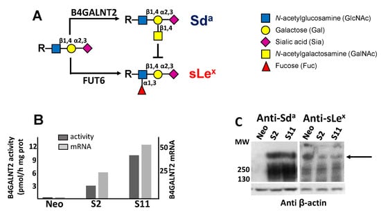 Owing to the clear association between high B4GALNT2 and better prognosis, the impact of B4GALNT2 expression on the malignant phenotype of a colon cancer cell line was studied using, as a model, LS174T cells transfected with the short form of B4GALNT2 or mock-transfected [8]. The three cell lines analyzed were Neo—a polyclonal population of mock-transfectants—and S2 and S11, two B4GALNT2-transfected clones. As shown in Figure 1B, the level of B4GALNT2 mRNA and enzyme activity in mock transfectants was nearly undetectable, while it was high in S2 and S11 clones. In S2 and S11 clones, but not in Neo cells, the Sda antigen was strongly expressed on high-molecular-weight proteins. On the other hand, the sLex antigen, which is also carried by high-molecular-weight proteins, was more strongly expressed by Neo cells than by S2 and S11 clones (Figure 1C). This is due to the previously documented competition between the fucosyltransferases synthesizing sLex and B4GALNT2 [8,14] (Figure 1A).