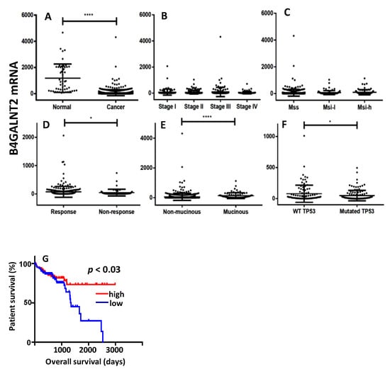 The Cancer Genome Atlas (TCGA) data. (A) Expression level of B4GALNT2 mRNA in normal mucosa and colorectal cancer (CRC) specimens. (B–F) Expression of B4GALNT2 mRNA in CRC specimens grouped according to stage (B), microsatellite stability status (C), response to therapy (D) subtypes (E), and TP53 mutation (F). (G) Kaplan–Meier survival curves of patients grouped in the groups of high expressers (15th upper percentile, red) or no expressers (15th lower percentile, blu) of mRNA B4GALNT2 expression. MSS: microsatellite stable; MSI-l: microsatellite instable-low; MSI-h: microsatellite instable-high. * p ≤ 0.05; **** p ≤ 0.0001.