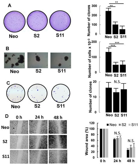 Compared with mock-transfected Neo cells, both S2 and S11 clones displayed a strongly reduced ability to grow in a semi-solid medium (soft agar) (Figure 3A), forming 20–40% of the clones formed by Neo cells.