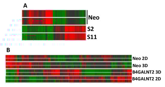To understand the origin of the dramatic effect of B4GALNT2 on the phenotype of LS174T cells and, in particular, on the ability to grow in non-adherent conditions, the impact of B4GALNT2 and of 3D growth in liquid medium on the transcriptome of LS174T cells was investigated by microarray analysis. Using this technology, the mean level of B4GALNT2 expression was found to be three in Neo and 230 in S2/S11 cells. The heat map graph displayed in Figure 5A reports the modulation of 142 genes showing a fold change ≥ 2 in LS174T S2 and S11, compared with Neo cells, grown in standard conditions.