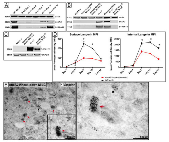 Because anx A2 is a key player in endosome biogenesis [32], next, we sought to investigate other ways that A2t could contribute to BG formation, such as mediating internal and surface langerin expression. Interestingly, predifferentiated MUTZ-3 do not express anxA2, however, M-LC do. M-LC lysates collected throughout the 14-day differentiation showed A2t expression beginning around day 10 (Figure 3A). AnxA2 was knocked-down in predifferentiated MUTZ-3 using a lentiviral sh RNA, causing S100A10 degradation as well (Figure 3B). We also found that overall langerin expression was decreased with anxA2 knockdown M-LC as compared with wild type (WT) M-LC (Figure 3C). Quantification of Western blot band densities are found in Supplemental Table S1.
