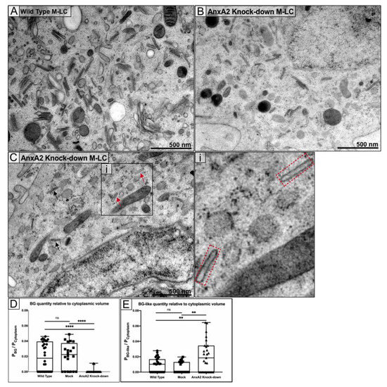 The most significant effect of anxA2 knockdown on M-LC was the near-disappearance of proper BG formation (Figure 4A,B). In addition to the decreased BG abundance, most BG found were incomplete as they were missing the central rod striations and had fewer misshapen heads but retained the unique flattened dimensions of BG rods (Figure 4C). We termed these abnormal structures as “BG-like”. To quantify the effect of anxA2 knockdown on BG formation, we compared WT and anxA2 knockdown M-LC using stereology [30], stitching together whole-cell cross-sections from individual TEM micrographs taken at 22,000×. Randomly chosen cells from two biological replicates were imaged and analyzed in 20 mock-infected, 30 wild type, and 27 anxA2 knockdown M-LC. BG and BG-like structures were quantified by overlaying 1 µm spaced grid on the cell and counting the grid intersection points that fall either on BG (PBG and PBG-like) or in the cytoplasm (Pcytoplasm) (Figure S3). The ratio of BG to cytoplasm in anxA2 knockdown M-LC was significantly decreased (p < 0.0001) as compared with wild type M-LC (Figure 4D). BG-like occurrence in anxA2 knockdown was also significantly increased as compared with wild type M-LC (p = 0.0056) (Figure 4E).