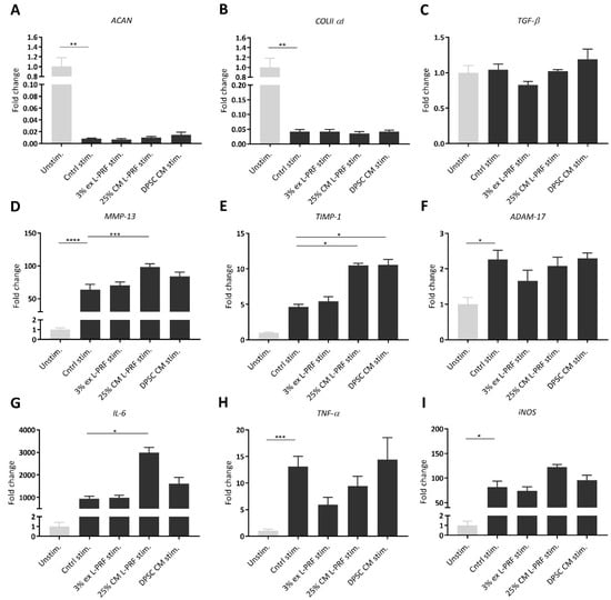 After iMACs were cytokine stimulated for 24 h and cultured in experimental conditions for another 24 h, gene expression levels of OA-related markers aggrecan, collagen type II α 1, TGF-β, MMP-13, TIMP-1, a disintegrin and metalloproteinase (ADAM)-17, IL-6, TNF-α and inducible nitric oxide synthase (iNOS) were measured. As shown in Figure 3, reverse transcriptase quantitative polymerase chain reaction (RT-qPCR) results showed that cytokine stimulation of iMACs significantly decreased cartilage-specific mRNA levels, such as aggrecan and collagen type II α 1, compared to unstimulated iMACs after 24 h (Figure 3A,B). No significant increase in aggrecan or collagen type II α 1 could be observed when iMACs were cultured with 3% L-PRF ex, 25% L-PRF CM or DPSC CM (Figure 3A,B). mRNA levels of TGF-β, a growth factor playing indispensable roles in cartilage integrity and homeostasis, were also measured using RT-qPCR and were not significantly altered (Figure 3C). TNF-α and IL-1β stimulation of iMACs increased mRNA levels of the chondrocyte maturation marker MMP-13 compared to unstimulated iMACs (Figure 3D). Moreover, 25% L-PRF CM significantly increased MMP-13 mRNA levels (Figure 3D), while TIMP-1 was significantly upregulated by the supplementation of pro-inflammatory cytokines combined with 25% L-PRF CM and DPSC CM compared to the stimulated control after 24 h (Figure 3E). ADAM-17 mRNA levels were significantly increased upon exposure to cytokines, but not altered by the supplementation of L-PRF ex, L-PRF CM or DPSC CM (Figure 3F). Cytokines with 25% L-PRF CM significantly amplified the IL-6 mRNA levels compared to the stimulated control (Figure 3G). TNF-α and iNOS mRNA levels were significantly increased upon exposure to cytokines, and are not altered upon supplementation of L-PRF ex, L-PRF CM or DPSC CM (Figure 3H,I).