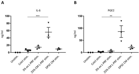 The medium of iMACs cultured in 3% L-PRF ex and 25% L-PRF CM and DPSC CM was collected after 24 h and subjected to an ELISA for IL-6 and PGE2 (Figure 4). Cytokine stimulation enhanced IL-6 production by iMACs, although not significantly, from 0 ng/mL for the unstimulated control to 6.31 ng/mL ± 1.65 ng/mL for the stimulated control (Figure 4A). Of all experimental conditions, only 25% L-PRF CM significantly enhanced IL-6 secretion (Figure 4A). Stimulation with cytokines in combination with 25% L-PRF CM induced a significant increase in PGE2 release by iMACs (86 ng/mL ± 24.14 ng/mL for stimulated 25% L-PRF CM compared to 2.75 ng/mL ± 1.11 ng/mL for the stimulated control) (Figure 4B).