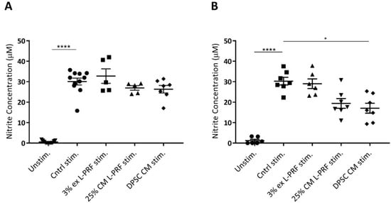 The effect of L-PRF ex, L-PRF CM and DPSC CM on TNF-α and IL-1β-stimulated iMAC nitrite release. Nitrite production in iMACs cultured in monolayer (A) and micropellet (B) was measured via the Griess assay. (A) In monolayer culture, nitrite production was significantly increased upon cytokine stimulation but not significantly altered by exposure to L-PRF ex, L-PRF CM and DPSC CM after 24 h. (B) In 3D micropellets, DPSC CM significantly reduced nitrite release of iMACs after 72 h. Data correspond to n = 5 for L-PRF ex and L-PRF CM, n = 7 for DPSC CM (A), n = 6 for L-PRF ex, n = 7 for L-PRF CM and DPSC CM (B). Data are represented as mean ± S.E.M. *. p ≤ 0.05. ****. p ≤ 0.0001.