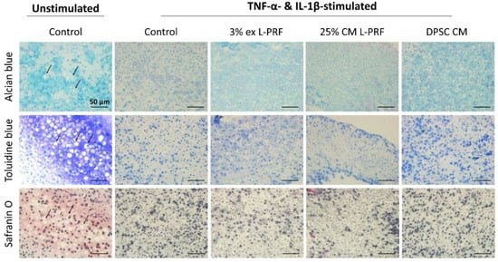To test the effect of secreted factors of L-PRF and DPSCs on the cartilage-matrix production of cytokine-stimulated iMACs, 5 × 105 iMACs cultured in micromasses were stimulated with TNF-α and IL-1β for 24 h. Afterwards, experimental conditions were added and 72 h later cell pellets were used for histological examination of the cartilaginous structure. Unstimulated iMAC pellets generated a typical cartilage-like tissue composed of chondrocytes in distinct lacunae surrounded by a dense PG-rich matrix as shown by representative images of alcian blue, toluidine blue and safranin O staining (Figure 6, arrowheads). However, pellets formed by cytokine-stimulated iMACs developed into a more fibrous tissue in which cartilage-lacunae were less evident and meaningfully decreased ECM and GAG production could be observed. This was revealed by an obvious decrease in alcian blue, toluidine blue and safranin O staining intensity (Figure 6). Cytokine-stimulated iMACs cultured with 3% L-PRF ex, 25% L-PRF CM and DPSC CM attained slightly more typical cartilage-like lacunae and showed a weak tendency of improved ECM content and chondrocyte status compared to the cytokine-stimulated control. A tendency to a higher alcian blue staining intensity could also be observed when cytokine-stimulated iMACs were cultured on L-PRF ex, L-PRF CM and DPSC CM.