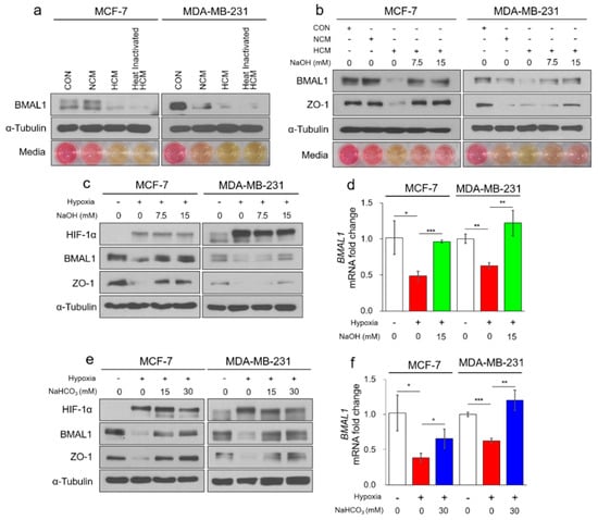 In hypoxia, many cells secrete protumorigenic cytokines, chemokines, and growth factors, which play important roles in tumorigenesis, such as recruiting diverse types of immune cells and accelerating angiogenesis [,]. We hypothesized that hypoxia-mediated secretory factors reduce BMAL1 expression in breast cancer cells. When MCF-7 and MDA-MB-231 breast cancer cells were exposed to hypoxic conditioned media (HCM), BMAL1 was reduced (Figure 2a). However, BMAL1 was also reduced in heat-inactivated HCM, in which all secretory proteins were degraded (Figure 2a). These results suggested that the hypoxia-mediated secretory proteins had no effect on the regulation of BMAL1, but other sources of HCM may be involved. We then observed that media containing phenol red was yellowish in HCM-treated MCF-7 cells, normoxic conditioned media (NCM), and HCM-treated MDA-MB-231 cells (Figure 2a bottom). This phenomenon exhibited a similar pattern as the decrease of BMAL1 expression. Since yellowish medium indicates that acidosis has occurred and in the previous study, the BMAL1 was disrupted under hypoxia-induced acidosis in osteosarcoma cells [], we expected that hypoxia-induced acidosis also reduced BMAL1 expression in breast cancer cells. BMAL1 was reduced by HCM, but was not reduced when the pH of the medium was neutralized by NaOH in a dose-dependent manner (Figure 2b and Supplementary Figure S2a). Many studies have reported that tight junction proteins are reduced in acidic conditions [,]. Since the tight junction protein ZO-1 was significantly reduced under acidic conditions, it was an indication that the breast cancer cells were involved in acidosis. In addition, the protein and mRNA levels of BMAL1 in MCF-7 and MDA-MB-231 breast cancer cells were reduced in chronic hypoxia but unchanged when the pH of the medium was neutralized by NaOH (Figure 2c,d) or buffered by NaHCO3 (Figure 2e,f and Supplementary Figure S2b). Together, these results showed that hypoxia-induced acidosis reduced BMAL1 expression, which could be prevented by selectively targeting the acidic pH in breast cancer cells.