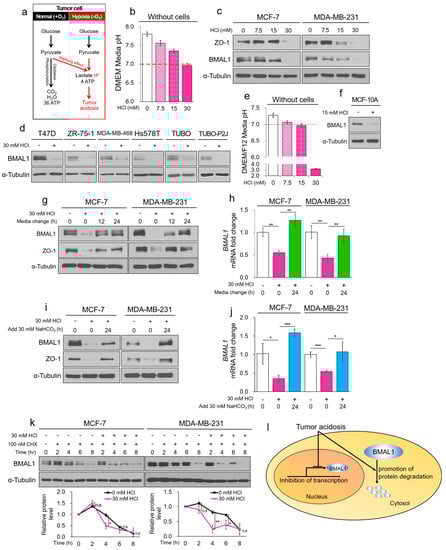 To determine whether BMAL1 was reduced only by tumor acidosis, we adjusted the pH of the cell culture medium using HCl (Figure 3b). When the acidic media were treated in MCF-7 and MDA-MB-231 cells for 24 h, media with pH < 7.0 reduced BMAL1 expression, and the cultured media of MCF-7 and MDA-MB-231 cells had pH values less than 6.7 (Figure 3c and Supplementary Figure S3a,b). Similar results were also obtained for T47D, ZR-75-1, MDA-MB-468, Hs578T human breast cancer, and TUBO and TUBO-P2J mouse breast cancer cell lines (Figure 3d). We also found that BMAL1 was reduced by HCl-mediated acidosis in MCF-10A normal breast cells (Figure 3e,f and Supplementary Figure S3c). Since reduced circadian genes in all organs can directly cause many diseases including cancer, continuously oscillating circadian genes are important for the treatment and prevention of diseases []. Notably, a decrease of BMAL1 by tumor acidosis was recovered by the exchanging acidic cultured media to fresh media (Figure 3g,h) or adding NaHCO3 to the acidic cultured media (Figure 3i,j and Supplementary Figure S3d). Additionally, we found that CLOCK was also reduced by tumor acidosis (Supplementary Figure S3e,f). The metabolic byproduct lactic acid is a major metabolite that induces hypoxia-mediated acidosis. BMAL1 is also reduced by lactic acidosis and recovered by exchanging media (Supplementary Figure S3g–i) or adding NaHCO3 (Supplementary Figure S3j–k). These results suggested that circadian BMAL1 was only reduced by acidosis and recovered by neutralizing and buffering the acidic pH in breast cancer cell lines. Under hypoxia and acidic conditions, while the protein level of BMAL1 was almost reduced (Figure 1a and Figure 3c), the mRNA level was not completely reduced in breast cancer cells (Figure 1e and Figure 3h,j). Since previous studies have reported that circadian genes including BMAL1 sustaining their circadian rhythms through transcription, protein post-translational modification, and protein degradation [], we hypothesized that other mechanisms may reduce BMAL1 protein levels by acidosis besides transcriptional inhibition. Cycloheximide (CHX), an inhibitor of de novo protein synthesis, decreased the half-life of BMAL1 protein expression in MCF-7 and MDA-MB-231 breast cancer cells (Supplementary Figure S3l). Notably, we found that the half-life of BMAL1 was shortened even further by acidic conditions and treatment with CHX (Figure 3k). Together, the results suggested that tumor acidosis reduced BMAL1 via inhibition of transcription and decrease of protein stability (Figure 3l).