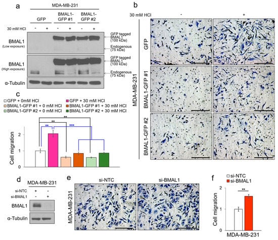 Tumor acidosis-mediated decrease of BMAL1 expression promotes metastatic potency in breast cancer cells. (a) The green fluorescent protein (GFP) or GFP-BMAL1 stably overexpressed MDA-MB-231 cell lines were incubated in HCl-mediated acidic condition for 24 h as indicated, and cell lysates were determined by immunoblotting. (b,c) GFP or GFP-BMAL1 stably overexpressed MDA-MB-231 cell lines were subjected to trans-well migration assay in HCl-mediated acidic condition for 24 h as indicated. Representative images of migrated cells are shown. Scale bars: 250 μm (b). The average number of migrated GFP or GFP-BMAL1 stably overexpressed MDA-MB-231 cell lines was counted in three random microscopic fields (c). (d) MDA-MB-231 was transfected with si-NTC or si-BMAL1. Cell lysates were determined by immunoblotting. (e,f) MDA-MB-231 was transfected with si-NTC or si-BMAL1, and was subjected to trans-well migration assay for 24 h. Representative images of migrated cells are shown. Scale bars: 250 μm (e). The average number of migrated MDA-MB-231 was counted in three random microscopic fields (f). Data represent the mean ± SD, n = 3. ** p < 0.01 and *** p < 0.001 vs. the control group or between two groups by a Student’s t-test.