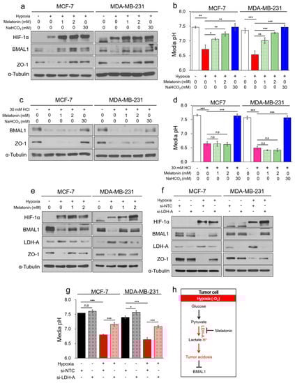 Melatonin attenuates decrease of BMAL1 expression by inhibiting hypoxia-mediated LDH-A in breast cancer cells. (a,b) MCF-7 and MDA-MB-231 were incubated in normoxia or 2% O2 hypoxia with melatonin or NaHCO3 for 48 h. Cell lysates were analyzed by immunoblotting (a) and pH of the cultured media was immediately measured using a pH meter (b). (c,d) MCF-7 and MDA-MB-231 were incubated in acidic condition with melatonin or NaHCO3 for 24 h. Cell lysates were analyzed by immunoblotting (c) and pH of the cultured media was immediately measured using a pH meter (d). (e) MCF-7 and MDA-MB-231 were incubated in normoxia or 2% O2 hypoxia with melatonin for 48 h. Cell lysates were analyzed by immunoblotting. (f,g) MCF-7 and MDA-MB-231 were transfected with si-NTC or si-LDH-A, and cells were incubated in normoxia or 2% O2 hypoxia for 48 h. Cell lysates were determined by immunoblotting (f) and pH of the cultured media was immediately measured using a pH meter (g). (h) The summarization of pathway that melatonin attenuates acidosis-mediated decrease of BMAL1 by inhibiting LDH-A in hypoxia. Data represent the mean ± SD, n = 3. * p < 0.05, ** p < 0.01, and *** p < 0.001 vs. the control group or between two groups by a Student’s t-test.