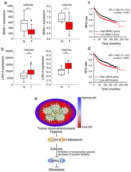 We then investigated the possible clinical relevance of BMAL1 expression between normal and breast cancer tissues using the GSE database. BMAL1 was significantly decreased in breast cancer compared with normal breast tissue in GSE5364 and GSE3744 (Figure 6a). In the same GSE databases, LDH-A, which induces hypoxia-mediated acidosis, was also higher in cancer tissues (Figure 6b). We additionally investigated whether the BMAL1 gene was associated with survival in breast cancer patients using the Kaplan–Meier (KM) database []. When breast cancer was divided into BMAL1 and LDH-A low or high groups by the mean median value, recurrence free survival (RFS) was higher in the BMAL1 high group than the BMAL1 low group and lower in the LDH-A high group than the LDH-A low group (Figure 6c,d). Furthermore, RFS was higher in the CLOCK high group than the CLOCK low group. These databases predicted that breast cancer involves hypoxia-induced acidosis, which reduces BMAL1 and CLOCK. As a result, expression of BMAL1 and CLOCK was associated with poor prognoses in breast cancer patients. Overall, our results demonstrated that chronic hypoxia induced acidosis, one of the most obvious tumor microenvironments, which reduced the BMAL1 circadian clock gene via inhibition of transcriptional activity and decreased protein stability in breast cancer, and reduced BMAL1 promoted metastatic potency, which could be prevented by targeting tumor acidosis using melatonin via inhibition of LDH-A (Figure 6e). We additionally suggest a possibility that CLOCK is also reduced under hypoxia-mediated acidosis and reduced CLOCK promotes breast cancer metastasis.