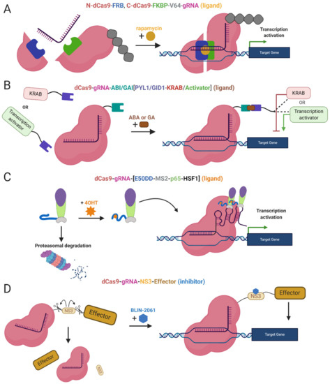 Moreover, other systems use ligands as inhibitors of proteolytic cleavage of a linker between dCas9 and the effector domain. The induction stands on the protease domain derived from the hepatitis C virus, ligand-inhibited NS3 protease. The protease domain connects dCas9 and the effector, the linker is cleaved unless the NS3 inhibitor is present. The inhibitor binds the NS3 domain and prevents separation of dCas9 from the effector (Figure 3D) [102]. A similar system takes advantage of proteasomal degradation, ligand-(Z)-4-hydroxytamoxifen (4OHT) binds a destabilized domain of the estrogen receptor fused to the effector domain and stabilizes it. In the absence of 4OHT, the whole effector complex is degraded in the proteasome. Thus, stabilization prevents degradation and the dCas9-effector complex is assembled and activated (Figure 3C) [103].