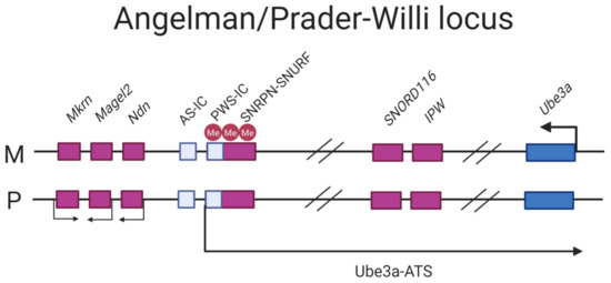 The mode of imprinting differs maternally and paternally in the locus. The maternally-inherited locus is associated with hypermethylation, with the imprint established in the gametes [113,114]. The paternal mode of imprinting is associated with hypomethylation of the region where silencing of the Ube3a gene is mediated by an antisense transcript (further referred to as Ube3a-ATS) that blocks the expression of the paternal copy in cis [115]. The transcription start site (TSS) of Ube3a-ATS initiates at the promoter/exon 1 region of the maternally imprinted gene SNRPN which is fully CpG methylated in the maternal copy and completely lacks methylation on the paternal one, rendering it transcriptionally active (Figure 4) [36].