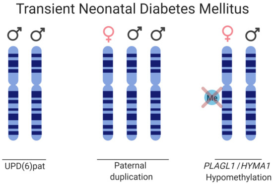 Transient neonatal diabetes mellitus type 1 (TNDM) is a rare ID affecting 1:400,000 births. TNDM is characterized by intrauterine growth retardation, failure to thrive in the neonatal stage, dehydration, macroglossia, umbilical hernia, and hyperglycemia requiring exogenous insulin for approximately three months after birth [140]. Endogenous levels of insulin are extremely sparse; however, by 18 months of age, the affected individuals have recovered [141]. Given appropriate treatment and recovery, this rare imprinting disease gives transient phenotypes, but there is a relapse rate of 40% later in life with type 2 diabetes, typically during adolescence. The affected, although diagnosed with type 1 diabetes in infancy, exhibits a type 2 diabetes profile if relapse occurs, as the affected does not have islet cell antibodies characteristic of the immunogenic type I diabetes, nor do they have HLA haplotypes which are diabetes susceptible. A region of 5.4 Mb on 6q24 that is subjected to differential methylation has been linked to TNDM [142]. Genetic and epigenetic etiologies causing TNDM can be grouped as follows: (i) paternal UPD; (ii) interstitial duplications of the paternal locus; and (iii) hypomethylation of the maternal allele allowing for transcription from a normally silenced allele (Figure 5) [143,144]. Analysis of the TNDM region identified two genes which, when overexpressed, cause TNDM, namely; PLAGL1 (pleomorphic adenoma gene-like 1), a zinc finger protein coding gene and HYMAI, an untranslated mRNA [145,146,147]. The maternal imprinting of the genes is modulated by methylation of the promoter/exon 1 of HYMAI, previously shown to be crucial for controlling gene expression in the TNDM mouse model [147].