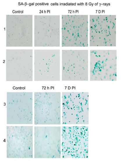 Detection of senescence-associated β-galactosidase (SA-β-gal) activity [31] was performed in control non-irradiated cells and 24 h, 72 h, and 7 days after cell exposure to γ-irradiation using a Senescence Detection Kit #K320-250 from Bio-Vision Incorporated (Milpitas, CA, USA), according to the manufacturer’s instructions. Before using the kit, the cells were fixed in 4% paraformaldehyde for 10 min at room temperature and washed three times in PBS. Images were captured using an Olympus BX51 microscope equipped with an Olympus DP72 camera and Quick Photo Micro 2.3 software at 200× magnification.