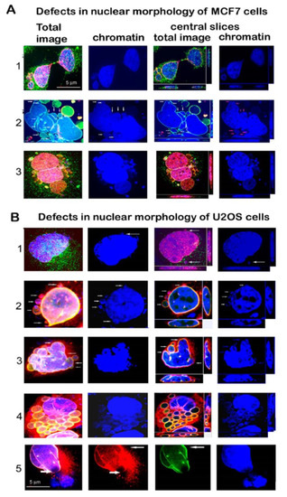 Control U2OS cells also had small defects in nuclear morphology before irradiation, consisting of the presence of small micronuclei in about 7% of cells and honeycombing in 1.2% of cells, indicating the disruption of the nuclear membrane (Figure 1B, Figure 3, Supplementary Table S1B). Similar to MCF7, U2OS cells already manifested changes in nuclear morphology in 60% of cells at 24 h PI (Figure 1B, Supplementary Table S1B). Most cells (33%) presented micronuclei, 28% of nuclei were giant, 22% of nuclei formed blisters, and 17% formed convoluted nuclei. Changes in nuclear morphology increased with time in all cells. About 66% of cells presented micronuclei, 63% were convoluted, about 56% formed blisters, 15% cells were fragmented, 11% exhibited honeycombing, and the same amount had giant nuclei at 72 h PI (Supplementary Table S1B). Contrary to MCF7, U2OS cells did not form anaphase bridges, while MCF7 did not present cells with giant nuclei after irradiation. There were no cells without morphological changes and such changes in nuclear morphology were very complex after a longer time period (Supplementary Table S1A,B). In U2OS cells, there was 5% honeycombing of the nuclei with interrupted NM and protrusion of chromatin into the cytoplasm and 39% of cells with giant nuclei 7 days PI. The most frequent morphological changes (both 71%) of U2OS cells were the formation of micronuclei and nuclei with a convoluted appearance, whilst fragmented nuclei formed 47% at this time (Supplementary Table S1B, Figure 3).