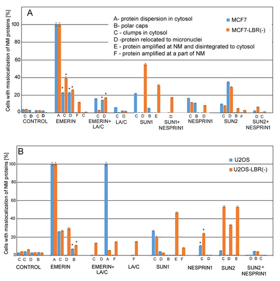 Graphical presentation of mislocalization frequency of LINC complex proteins (nesprin-1, SUN1, SUN2), emerin, and LA/C in irradiated cells. (A) MCF7 cell line and derived LBR(-) cells, (B) U2OS cell line and derived LBR(-) cells. The data are presented as a percentage from the mean cell number ± SE. The differences between parental cells and derived clones were significant for almost all LINC complex proteins. The data were collected from 3 independent experiments and more than 100 cells were counted in each. In less obvious cases, differences between LBR(-) and original cells were statistically evaluated (t-test, p ≤ 0.05, asterisks).