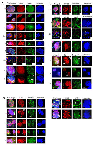 (A) Examples of mislocalization of emerin in MCF7 and U2OS cells irradiated with 8 Gy of γ-rays 24 h PI. 0—Control MCF7 cell, 1—MCF forming anaphase bridge and MN, some of MN are filled with emerin, which is also dispersed in the cytosol. 2—U2OS divided into 2 nuclei located in close proximity. A part of emerin is dispersed in the cytosol and another part forms short fragments together with LA/C at the NE. Chromatin is condensed into fragments resembling senescence-associated heterochromatic foci (SAHF) in senescent cells, better distinguishable on 2a presenting a central slice through figure 2 and showing that lamin A/C together with emerin form an interrupted layer in the NE of these two nuclei and both proteins are partially dispersed into the cytosol. 3—MCF7 with dispersed emerin in the cytosol, some MN are also filled with emerin and heterochromatin. In addition, emerin is amplified in a region of the NE (arrow). The nucleus has a section of an anaphase bridge in the lower left corner (thick arrow). 4—Convoluted nucleus of MCF7 with emerin forming polar caps. A layer of emerin is weakened in the NE, LA/C binds nuclei and MN. Its layer is also weakened at some positions in the NE. 5a—central slice through MCF7 nuclei shows interrupted LA/C (green) and emerin (red) in the NE (thin arrows). 6—Giant U2OS nucleus with fragmented LA/C, emerin is dispersed in the nucleus. 7—U2OS-LBR(-) with reinforced LA/C (green) and emerin (red) at a lower part of the nucleus (narrow arrow). Emerin is dispersed in the cytoplasm and in MN in this region. Both proteins are lost at the upper part of the nucleus (wide arrow). Size bar indicates 5 µm. (B). Examples of SUN1 and nesprin-1 mislocalization in MCF7 and U2OS cells 24 h PI with 8 Gy of γ-rays. 1a—Central slices through the nucleus of MCF7 control show SUN1 and nesprin-1 location in the whole nucleus. 2—Convoluted nucleus of U2OS, where one part is formed by one large and one middle-sized MN containing normal chromatin and SUN1, but another part has condensed and fragmented chromatin divided into several MN bordered partially by LA/C and filled by SUN1 (arrows), better seen in 2a—slice showing interrupted LA/C. The arrows in the total image show fragments of SUN1 bordered by LA/C. Two of these fragments also contain heterochromatin (2 arrows). Fragments of SUN1 were probably released from the disrupted nucleus containing heterochromatic residues. Heterochromatin is highly condensed resembling SAHF (arrows at the slice through the image). 3—Convoluted nucleus of MCF7 containing 2 large MN, several blisters, and small MN bordered by LAC and filled by SUN1. Small clumps of SUN1 in the cytoplasm (arrows). 4—MCF7 containing amplified SUN1 in the nucleus, small clumps of SUN1 in the cytosol (arrows), and a cloud of minor dots of SUN1 (thick arrow) accompanied by a dense layer of nesprin-1 dots (long arrow). A clump of nesprin-1 forms a polar cap on the nucleus (arrow). 5—Tweens of MCF7 daughter nuclei connected by a thin anaphase bridge have fragmented SUN1 in the NE (arrows). Fragments of SUN1 are loosened from the NE into the cytosol. Nesprin-1 forms a layer of dots in the NE and surrounds the nuclei. 6—U2OS nucleus with amplified SUN1 and a clump (arrow) containing SUN1 and nesprin-1. Size bar indicates 5µm. (C) Examples of SUN2 and nesprin-1, as well as SUN2 and LA/C, mislocalization in MCF7 and U2OS cells at 24 h and 72 h PI with the dose of 8 Gy of γ-rays. 1—MCF7 control nucleus with visualized SUN2 and nesprin-1. 2—MCF7 convoluted nucleus composed of 2 large nuclei in close proximity and 2 MN containing heterochromatin (small arrow in the image of chromatin) and 2 MN with euchromatin (long arrow). In addition, two large fragments of SUN2, containing small fragments of nesprin-1 and heterochromatin (thin arrows) are visible. One of these fragments occurs in the cytosol and the other forms an apical cap. The other of the 2 large nuclei also gained an apical cap formed by a large fragment of nesprin-1 with some small dots of SUN2. 3—Two nuclei connected by a fine anaphase bridge have several MN containing heterochromatin (arrow) or euchromatin bordered by SUN2. Thick arrow shows a clump of SUN2 as apical cap. Nesprin-1 formed tiny dots in the cytoplasm, the NE, and the nuclei. 4—Anaphase bridge binding two MCF7 daughter nuclei. Both nuclei have many MN mostly containing euchromatin and are bordered by SUN2. At the left nuclei is a group of MN filled with SUN2 and nesprin-1 (arrow). A fragment of SUN2 with nesprin-1 also forms a polar cap on the first nucleus and fragments of nesprin-1 are at the surface of the second nucleus. SUN2 is present at an increased level in these nuclei, especially at their narrowing sites at the anaphase bridge. Note, splitting of SUN2 into tiny dots forming clouds around nuclei and MN (arrows in the image showing only SUN2). 5—Convoluted nucleus of U2OS with amplified SUN2 at a part of the nucleus and in MN also containing heterochromatin and nesprin-1. Around the amplified SUN2, a cloud of a tiny dots of SUN2 is formed that is accompanied by a cloud of nesprin-1 dots. 6—Convoluted nucleus of U2OS 72 h PI containing a reinforced layer of SUN2 together with LA/C in several regions of the NE (arrows). In addition to amplified SUN2 in the NE, there are several MN attached to the nucleus as polar caps that are also filled with SUN2. 7—Convoluted nucleus of MCF7 72 h PI composed of 3 large nuclei with several heterochromatic MN attached as polar caps filled with SUN2 and LAC. The level of SUN 2 is reinforced in the NE of the upper nucleus. Size bar indicates µm.