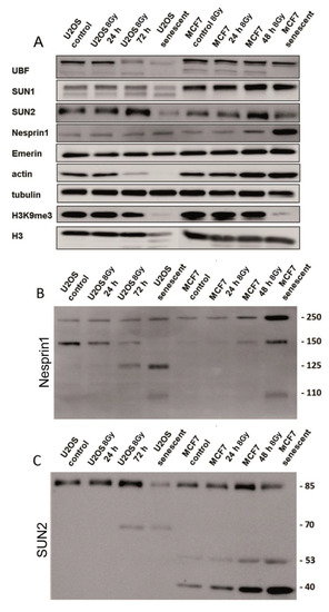 The level of LINC proteins as well as other proteins known to be involved in cellular responses to irradiation were investigated by Western blots (Figure 6A–C). The proteins were assayed in control cells 24 h, 72 h, and 7 days post irradiation (PI) in MCF7 and U2OS cells. The U2OS cells showed a reduction of SUN2 and actin proteins at 72 h PI and in senescent cells (day 7 PI) but were not observed in MCF7 cells (Figure 6A). On the other hand, the level of nesprin-1 was increased in senescent MCF7 cells (day 7 PI) compared to the control and earlier post irradiation periods. Overall, there were either minor or no actual changes in LINC protein expression in irradiated cells and the differences in individual protein levels seem to be cell-type-specific. However, in both cell lines, there was a consistent decrease in H3K9m3 and UBF (45S rDNA transcription factor) at later time intervals.