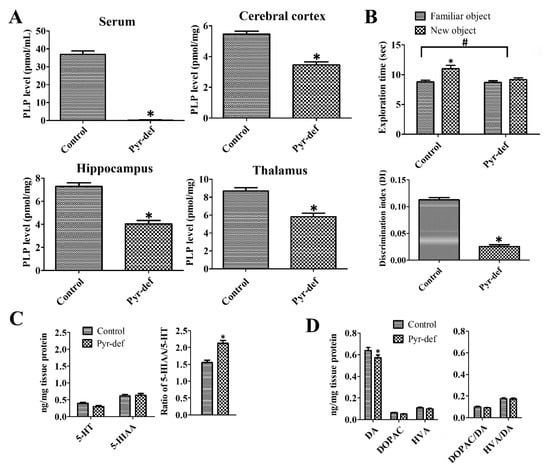Pyridoxine deficiency (Pyr-def) decreases serum and brain pyridoxal 5′-phosphate (PLP) levels, novel object recognition memory, and monoamine levels in the hippocampus. (A) PLP concentration in serum and brain regions (cerebral cortex, hippocampus, and thalamus); data are analyzed with the Student’s t-test (n = 20 per group; * p < 0.05). (B) Exploration time for familiar and new objects and the discrimination index in control and Pyr-def mice; data were analyzed with two-way ANOVA followed by Bonferroni post-tests (n = 7 per group; * p < 0.05, significant difference between familiar and new object, # p < 0.05, significant difference between control and Pyr-def group) and Student’s t-test (n = 7 per group; * p < 0.05). (C) 5-Hydroxytryptamine (5-HT), its metabolite (5-HIAA), and ratio (5-HIAA/5-HT) in the hippocampus of control and Pyr-def mice measured with HPLC analysis (n = 7 mice per group; * p < 0.05). (D) Levels of 3,4-Dihydroxyphenethylamine (DA), 3,4-dihydroxyphenylacetic acid (DOPAC), homovanillic acid (HVA), and ratio (DOPAC/DA and HVA/DA) in the hippocampus of control and Pyr-def mice measured through HPLC analysis (n = 7 mice per group; * p < 0.05).