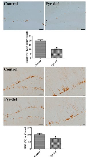 In the control and Pyr-def groups, Ki67-positive proliferating cells were found in the subgranular zone of the dentate gyrus. However, the number of Ki67-positive cells in the Pyr-def group was 49.6% (p = 0.0006) of that in the control group (Figure 2).
