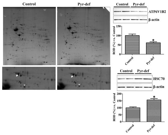 Based on SWISS-PROT and NCBInr databases, 10 spots showed no significant hits to report because of small amounts of the peptide. The other 31 spots were identified based on MALDI-TOF MS analysis and are listed in Table 1 and Table 2. Among these identified candidate proteins, we considered several factors such as the number of matched peptides, coverage, and the theoretical MOlecular Weight Search (MOWSE) score. The most reliable proteins, which had a high number of peptides matched in the identified protein and protein sequence coverage, were V-type proton ATPase subunit B, brain isoform (ATP6V1B2) and heat shock cognate protein 70 (HSC70). The standard abundance values of ATP6V1B2 were significantly lower, while those of HSC70 were significantly higher in the Pyr-def group compared to the control (Figure 3).