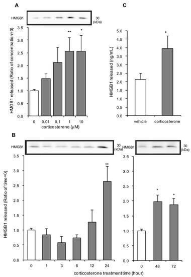 Concentrations of 1 µM and 10 µM of corticosterone significantly increased HMGB1 release after 24 h treatment (Figure 1A). A lower concentration of corticosterone tended to increase extracellular HMGB1. Concentrations of corticosterone up to 10 µM were not cytotoxic, indicating that HMGB1 release observed with 1 µM and 10 µM of corticosterone was not a result of nonspecific cytotoxicity or necrosis (Supplementary Materials Figures S1A and S2A). Next, time course experiments were conducted. With 1 µM corticosterone treatment, extracellular levels of HMGB1 were significantly increased at 24 h after treatment and were increased for at least 72 h (Figure 1B).