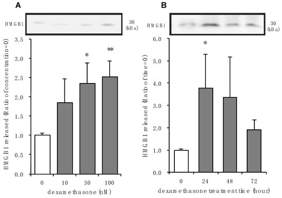 The effect of dexamethasone on HMGB1 release in primary cultured cortical astrocytes. (A) Increasing concentrations of dexamethasone induced HMGB1 release from astrocytes. Cells were treated with the indicated concentrations of dexamethasone for 24 h, and the amount of HMGB1 in the media was analyzed by Western blotting. Representative blots are shown (HMGB1: 30 kDa). The data are expressed as the mean ± SEM. * p < 0.05, ** p < 0.01 vs. basal (concentration “0”) (Dunnett’s test; n = 4–10). (B) Astrocytes were treated with 100 nM dexamethasone for the indicated periods of time and the amount of HMGB1 in the media was analyzed by Western blotting. Representative blots are shown (HMGB1: 30 kDa). The data are expressed as the mean ± SEM. * p < 0.05 vs. basal (time “0”) (Dunnett’s test; n = 5–12).