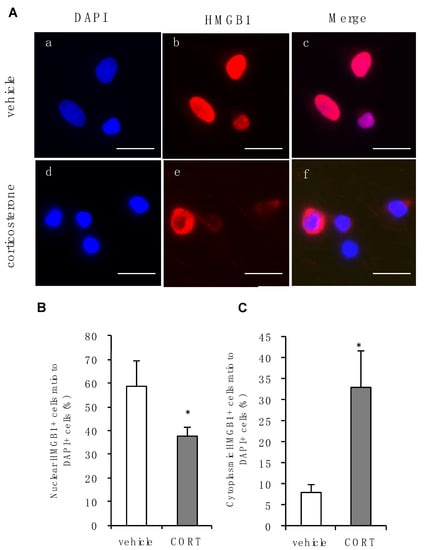 Effects of corticosterone on intracellular localization of HMGB1 in primary cultured cortical astrocytes. (A) Immunocytochemistry of HMGB1 in rat primary cultured cortical astrocytes. Corticosterone-treated cells (CORT; 1 μM, 24 h) exhibited subcellular HMGB1 expression compared with vehicle. Images a, b and c, or d, e and f, are from the same fields, respectively. Scale bar = 20 μm. (B) The percentage of nuclear staining of HMGB1 to total DAPI positive cells decreased after corticosterone treatment. The data are expressed as the mean ± SEM. * p < 0.05 vs. vehicle (t-test; n = 3–4). (C) The percentage of cytoplasmic staining of HMGB1 to total DAPI positive cells increased after corticosterone treatment. The data are expressed as the mean ± SEM. * p < 0.05 vs. vehicle (t-test; n = 3–4).