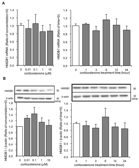 It is possible that corticosterone, which induces gene transcription, upregulated HMGB1 mRNA expression. Concentrations up to 10 µM of corticosterone for 24 h did not affect HMGB1 mRNA and total intracellular HMGB1 protein expression (Figure 4A,B). No significant changes in HMGB1 mRNA and intracellular HMGB1 protein expression were observed during the entire 24 h incubation period with 1 µM corticosterone (Figure 4A,B).