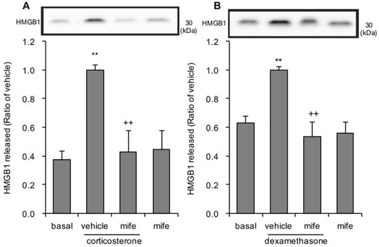 Effects of glucocorticoid receptor antagonist on corticosterone or dexamethasone-induced HMGB1 release in primary cultured cortical astrocytes. (A) Astrocytes were pretreated with 0.5 μM mifepristone (mife) for 30 min, and subsequently treated with 1 μM corticosterone for 24 h. The amount of HMGB1 in the media was quantified by Western blotting. Representative blots are shown (HMGB1: 30 kDa). The data are expressed as the mean ± S.E.M. ** p < 0.01 vs. basal and ++ p < 0.01 vs. corticosterone alone. (Tukey’s HSD test; n = 6–10). (B) Astrocytes were pretreated with 0.5 μM mifepristone (mife) for 30 min, and subsequently treated with 100 nM dexamethasone for 24 h. The amount of HMGB1 in the media was quantified by Western blotting. Representative blots are shown (HMGB1: 30 kDa). The data are expressed as the mean ± S.E.M. ** p < 0.01 vs. basal and ++ p < 0.01 vs. dexamethasone alone. (Tukey’s HSD test; n = 5–9).