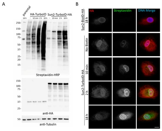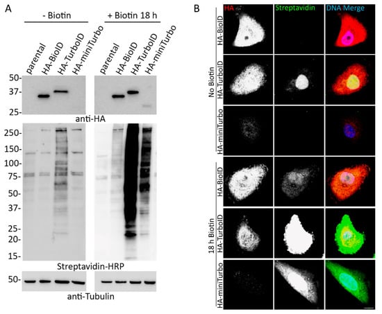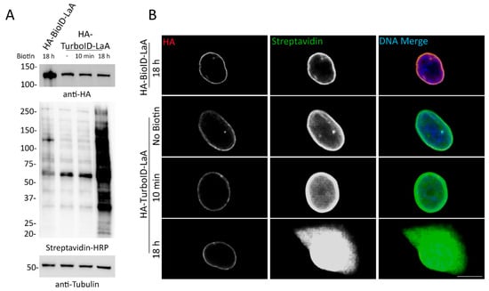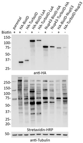 While BioID/BioID2 have been applied successfully in many model systems including in live cultured cells, yeast [16,17], parasites [18,19,20,21,22,23,24], plants [25,26], and mice [27,28,29,30], most experiments have been performed utilizing a 12–24 h labeling period, with few exceptions labeling for 1 h or 3 h [31,32]. Experiments requiring shorter labeling periods require a faster version of BioID and one that would work well at temperatures well below 37 °C. Two groups have reported versions of BioID that address some or all of these limitations. A B. subtilis-based version of BioID [33], called BASU, that was used to map RNA–protein interactions was originally claimed to be 1000 times faster than the original BioID, but these results have not been reproducible [34]. More recently, a directed-evolution variant of BioID, called TurboID, was reported to be substantially faster than the original BioID ligase and capable of functioning effectively at lower temperatures [34]. In that same study, a smaller version of TurboID (termed miniTurbo) was also developed by removing the N-terminus of TurboID. Here, we comparatively evaluate the practical application and labeling radius of TurboID and the original BioID. We use previously validated baits in the nuclear envelope—including Lamin A (LaA), Nup43, and Nup53—in order to reveal optimal practical applications and to better characterize the growing toolbox of proximity-dependent labeling biotin ligases [6,13].