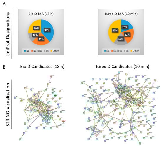 Post-pulldown proteomic analysis of LaA PPI candidates. (A) Following MS data analysis, BioID- and TurboID-LaA candidates were submitted to UniProt using the “Retrieve/ID Mapping” tool and subsequently grouped by subcellular domain designations. (B) Candidates were also submitted for STRING analysis visualization.